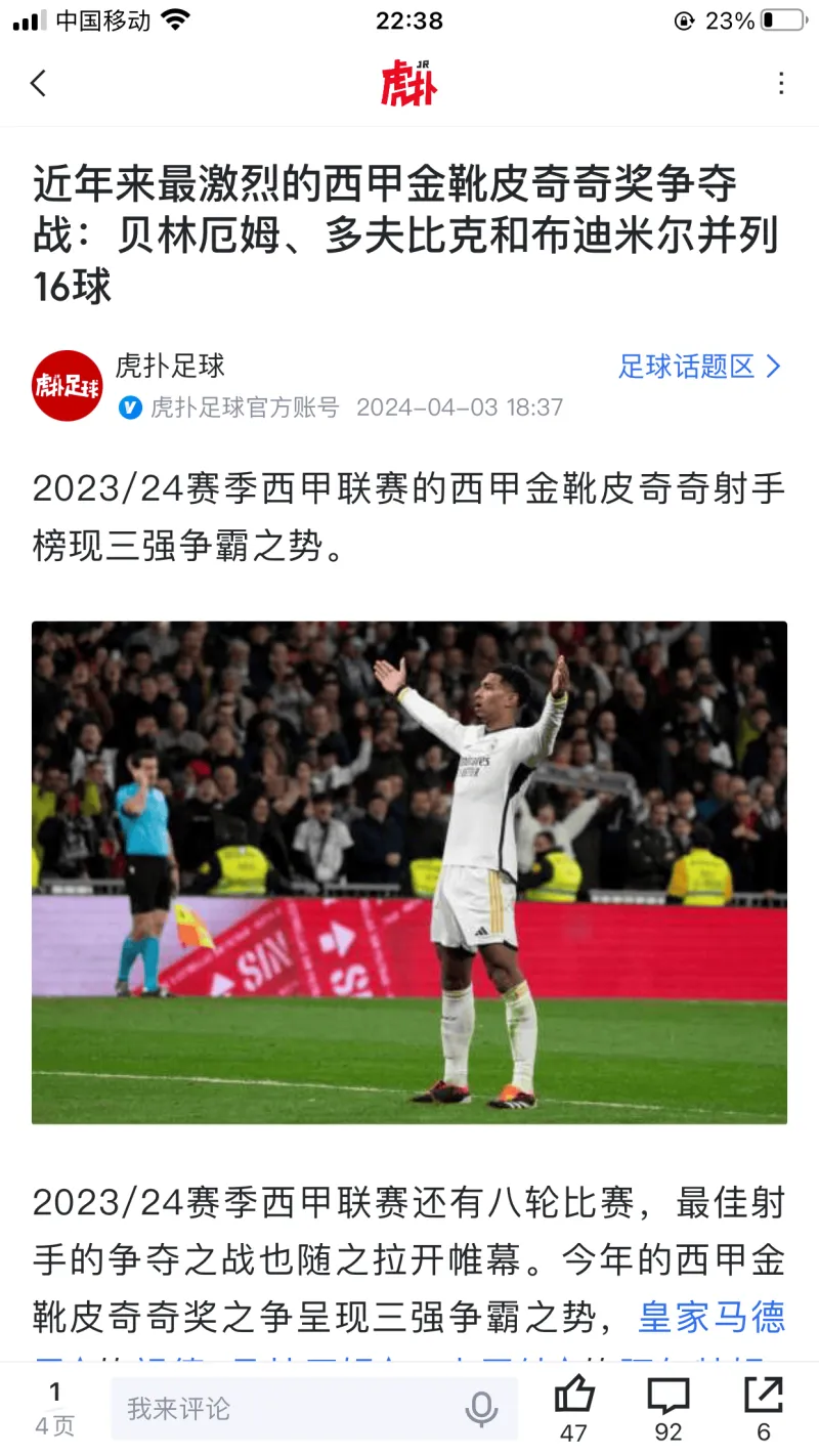 歐冠淘汰拜仁后,反駁此時聯(lián)賽還有4輪,虛假還有機會沖擊金靴獎。貝林