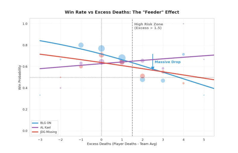 但他一旦比隊(duì)友多死 1.6 個(gè)以上,BLG勝率直接雪崩到 49%。