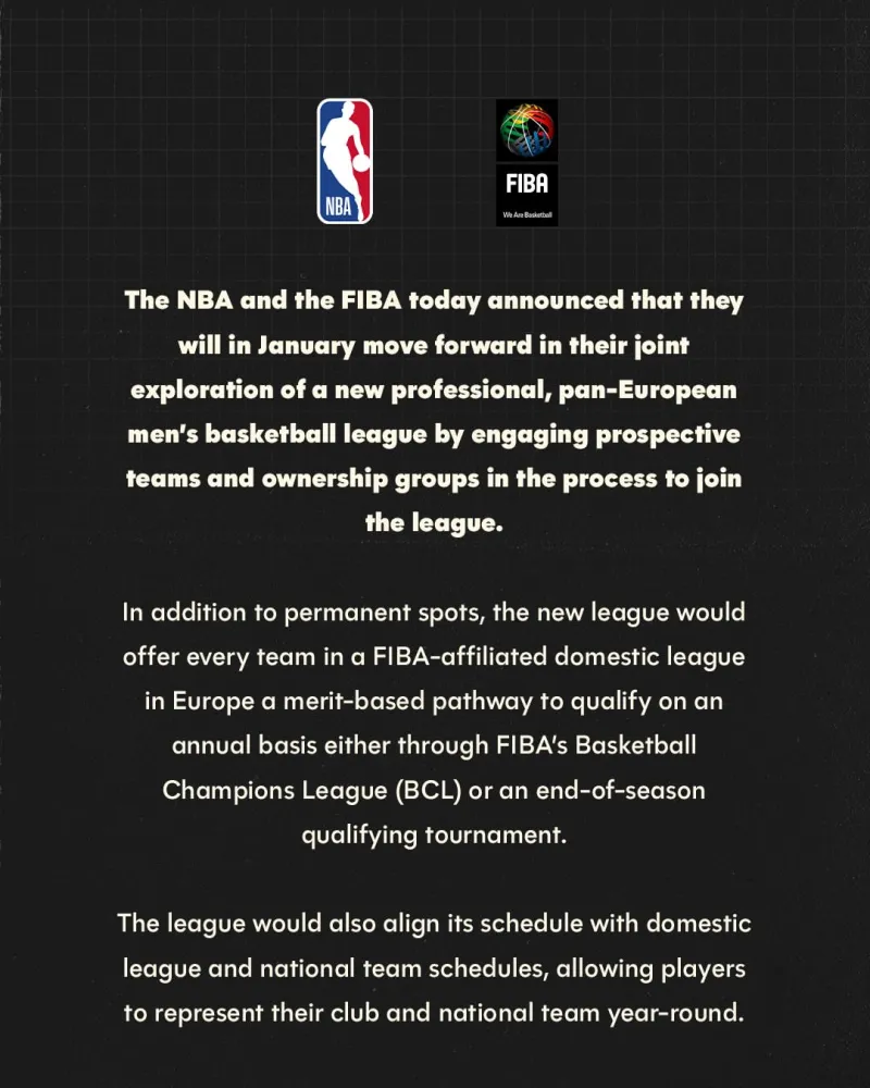 美國國家籃球協(xié)會(NBA)和國際籃球聯(lián)合會(FIBA)今日宣布,將于1月推進(jìn)聯(lián)合探索成立新職業(yè)泛歐洲男子籃球聯(lián)賽的進(jìn)程,邀請潛在球隊及所有權(quán)集團(tuán)加入聯(lián)盟。