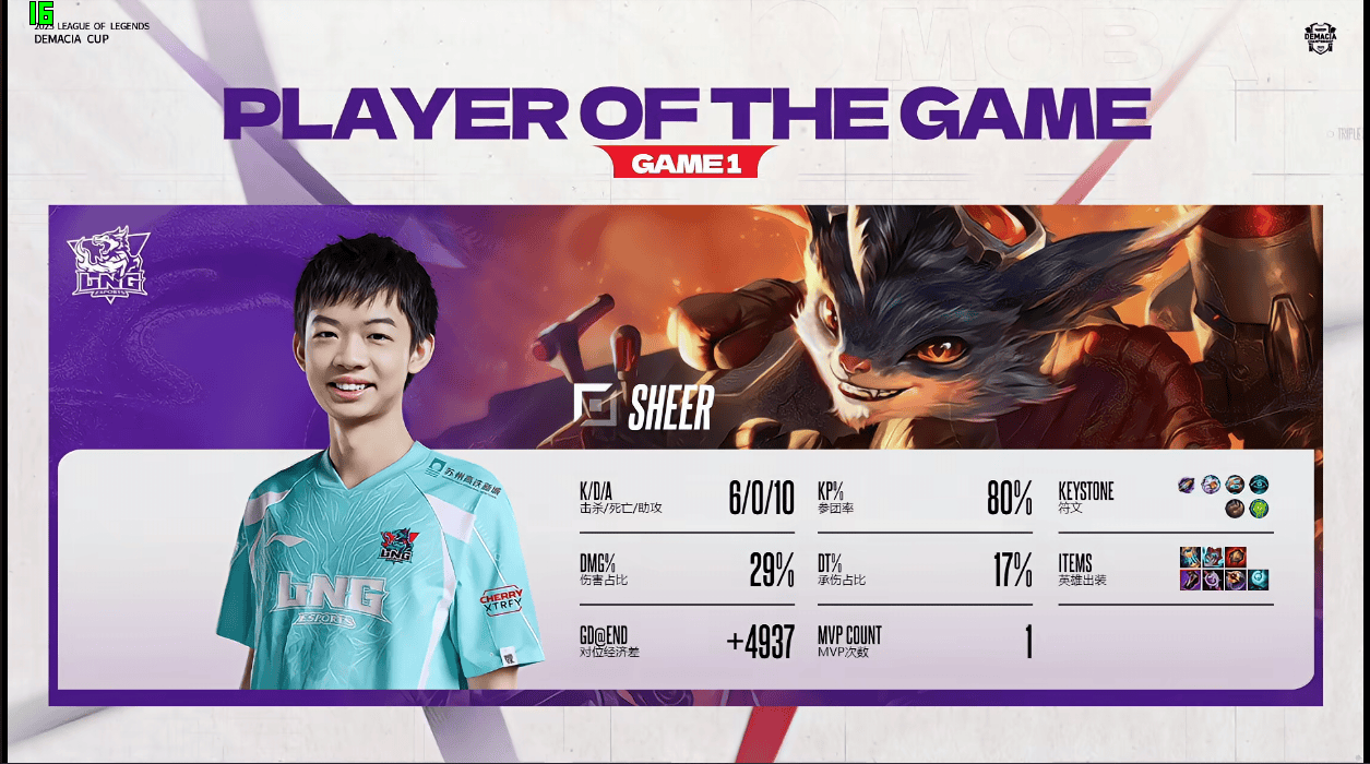 [流言板]sheer蘭博打出6/0/10戰(zhàn)績,斬獲LNG對陣JDG第一局MVP