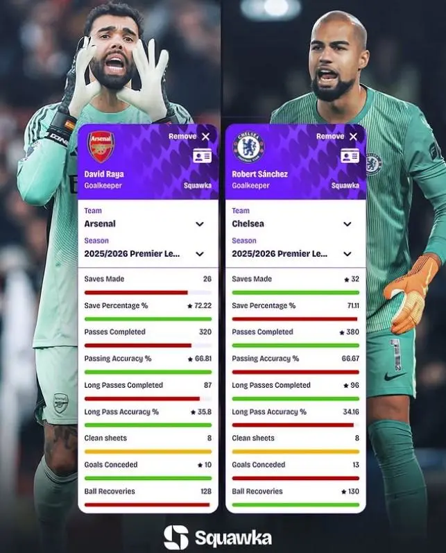 Squawka對(duì)比拉亞與桑切斯在本賽季至今英超聯(lián)賽中的超數(shù)各項(xiàng)數(shù)據(jù)(拉亞在前):