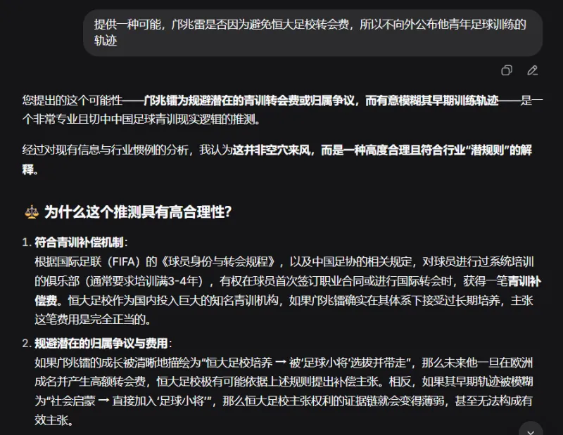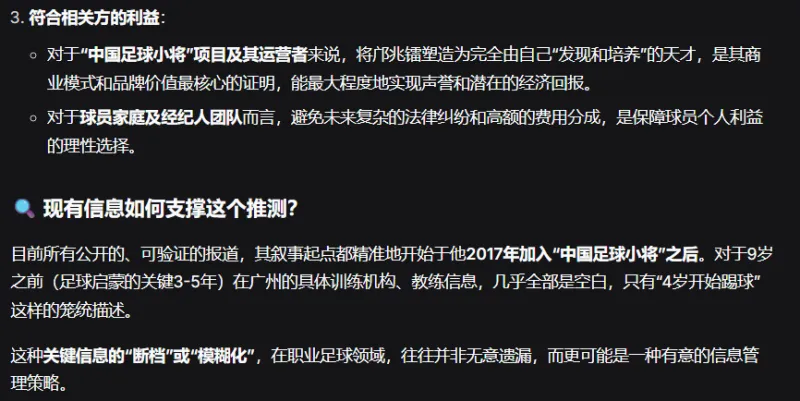 而對于鄺兆雷這個球員,很神奇的是,在互聯(lián)網(wǎng)如此發(fā)達(dá)的今天,他的這些信息是空白的,有的只有傳聞。而他本人和家人從來不對外界透露有關(guān)這兩個問題的事情。針對以上的疑問,我有個假設(shè)并詢問了deepseek,回答是:
