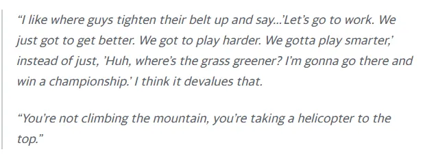 約翰-斯托克頓表示:“我更欣賞球員們系緊褲腰帶表態(tài):'讓我們埋頭苦干!只需變得更強(qiáng)、打得更拼、戰(zhàn)術(shù)更聰明。' 而不是輕率決定:'嘿,哪兒的草更綠?我要去那兒拿冠軍。' 這種行為貶低了冠軍的含金量。你這不叫攀登高峰,是坐直升機(jī)直達(dá)山頂。”