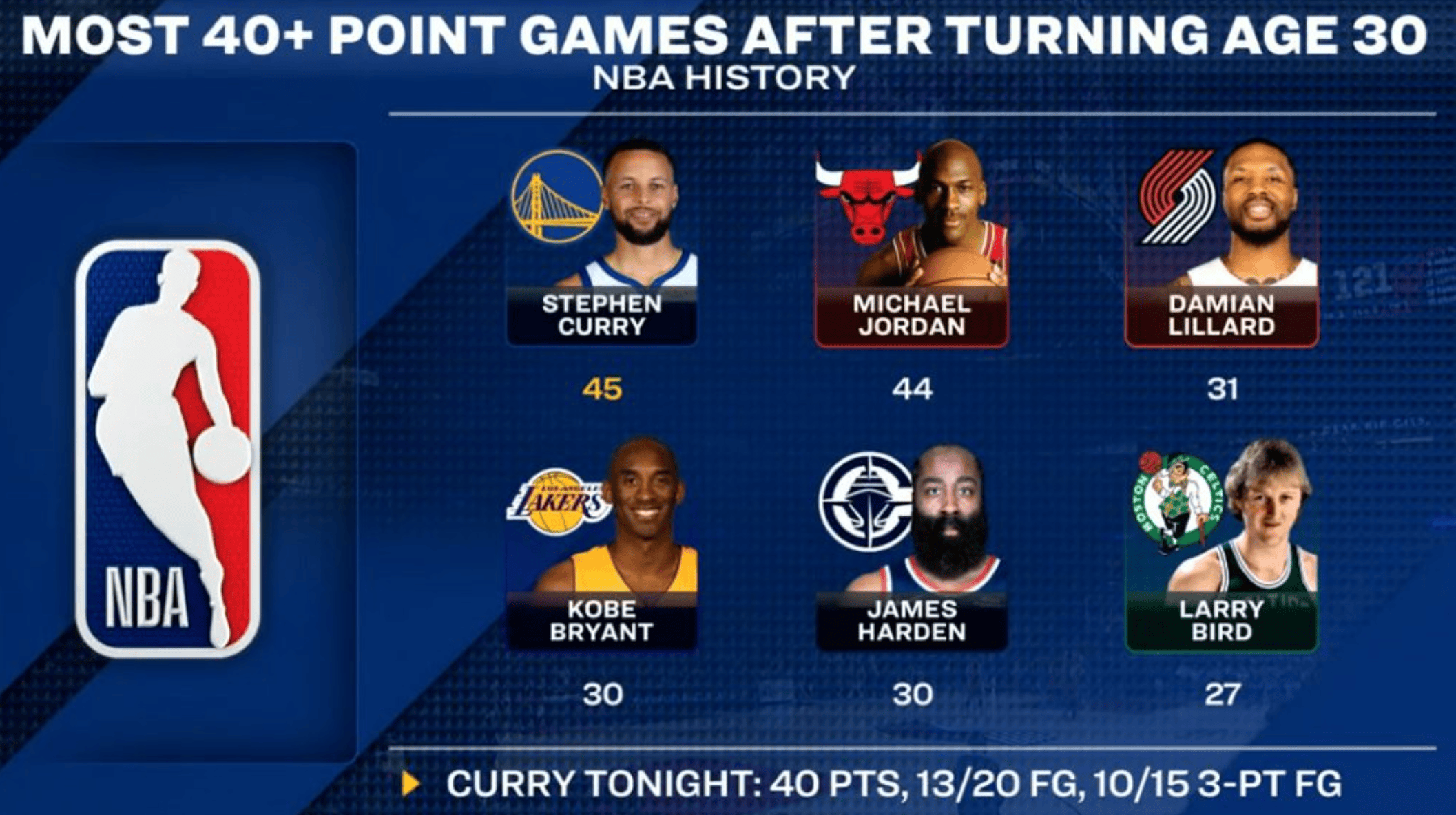 至此,越喬庫(kù)里在30歲后已經(jīng)45次單場(chǎng)拿到40+得分,至歷他超越邁克爾-喬丹,升至這項(xiàng)數(shù)據(jù)的歷史第一。