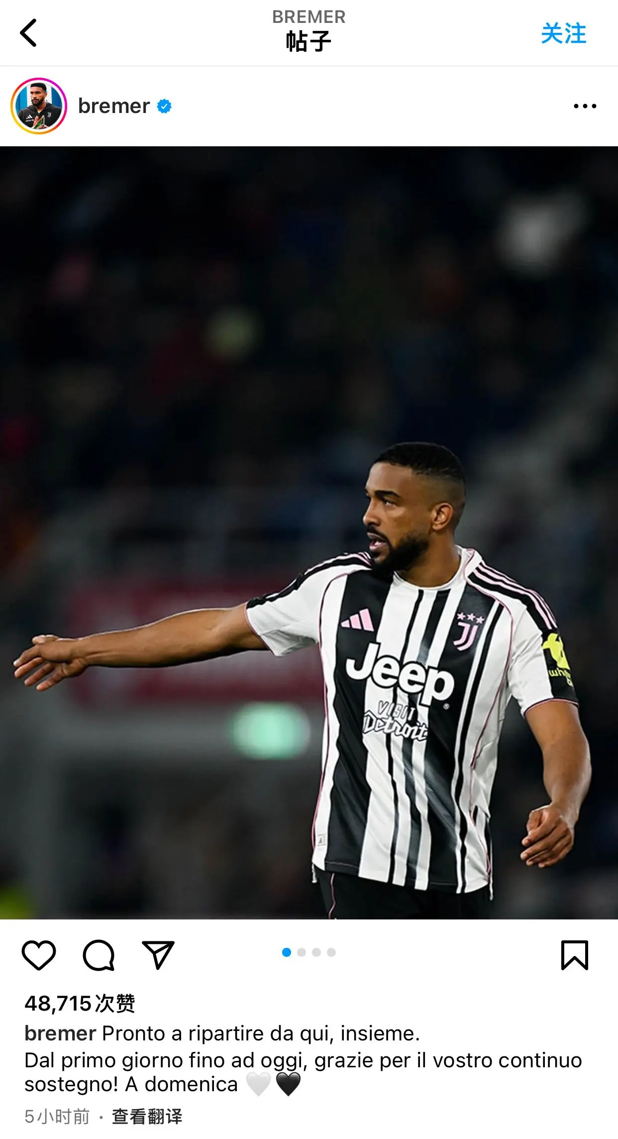 虎撲12月15日訊 布雷默在對陣博洛尼亞的比賽中傷愈復(fù)出,這名尤文后衛(wèi)更新了Instagram: