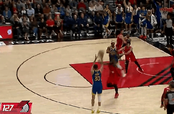 NBA常規(guī)賽,勇士對陣開拓者的庫里比賽正在進(jìn)行中。