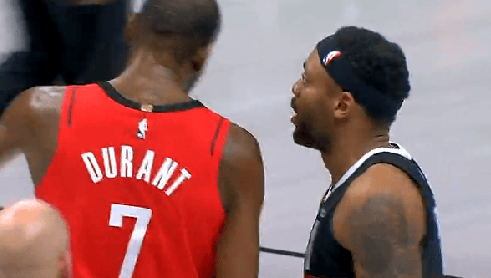 比賽的?;鸬谌?jié),掘金打?;鸺?,前隊杜蘭特與前隊友布魯斯-布朗發(fā)生口角。友布
