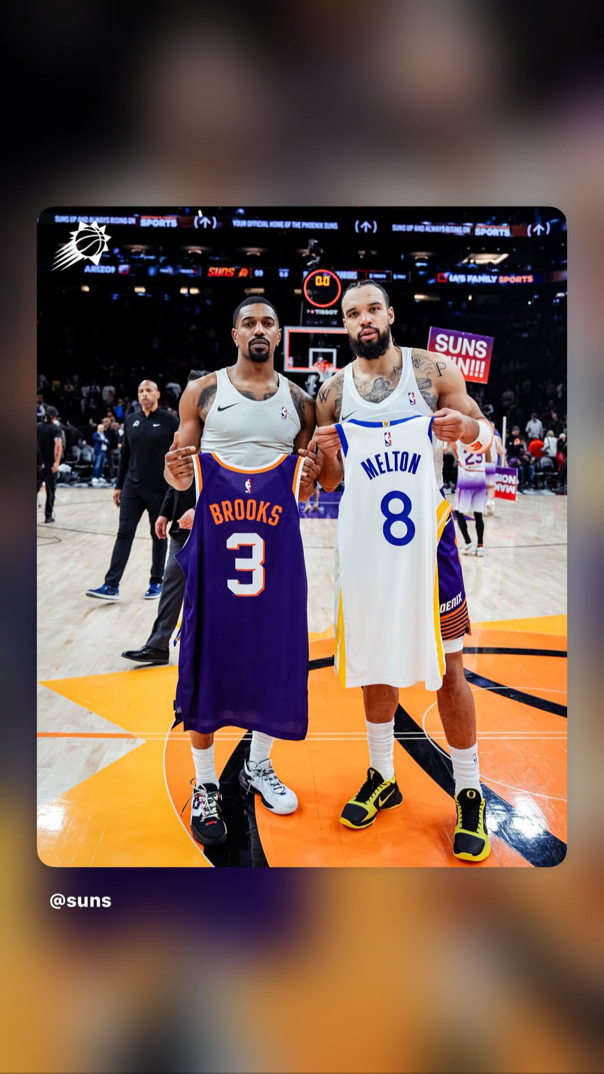 賽后,球衣勇士球員梅爾頓和太陽球員狄龍-布魯克斯交換球衣并合影留念。流言龍社