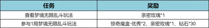 活動期間參與夢境無限亂斗玩法領(lǐng)驚奇魔盒、親密玫瑰等獎勵!