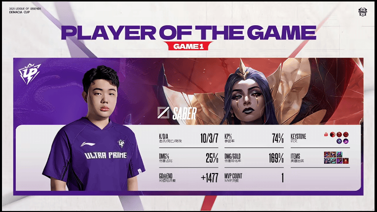 [流言板]Saber使用妖姬打出10/3/7戰(zhàn)績,斬獲UP對陣FRK第一局MVP