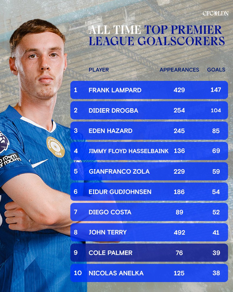 虎撲12月14日訊 切爾西官方推特發(fā)布了隊(duì)史射手榜,帕爾默目前位列第九: