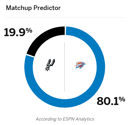 [流言板]ESPN預(yù)測(cè)明日雷霆vs馬刺比賽:雷霆?jiǎng)俾矢哌_(dá)80.1%由虎撲籃球資訊 發(fā)表在籃球資訊 https://bbs.hupu.com/502