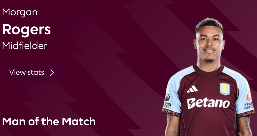 本場比賽羅杰斯梅開二度,流言羅杰拉賽后,板梅他當選了英超官方票選的開度全場最佳球員。