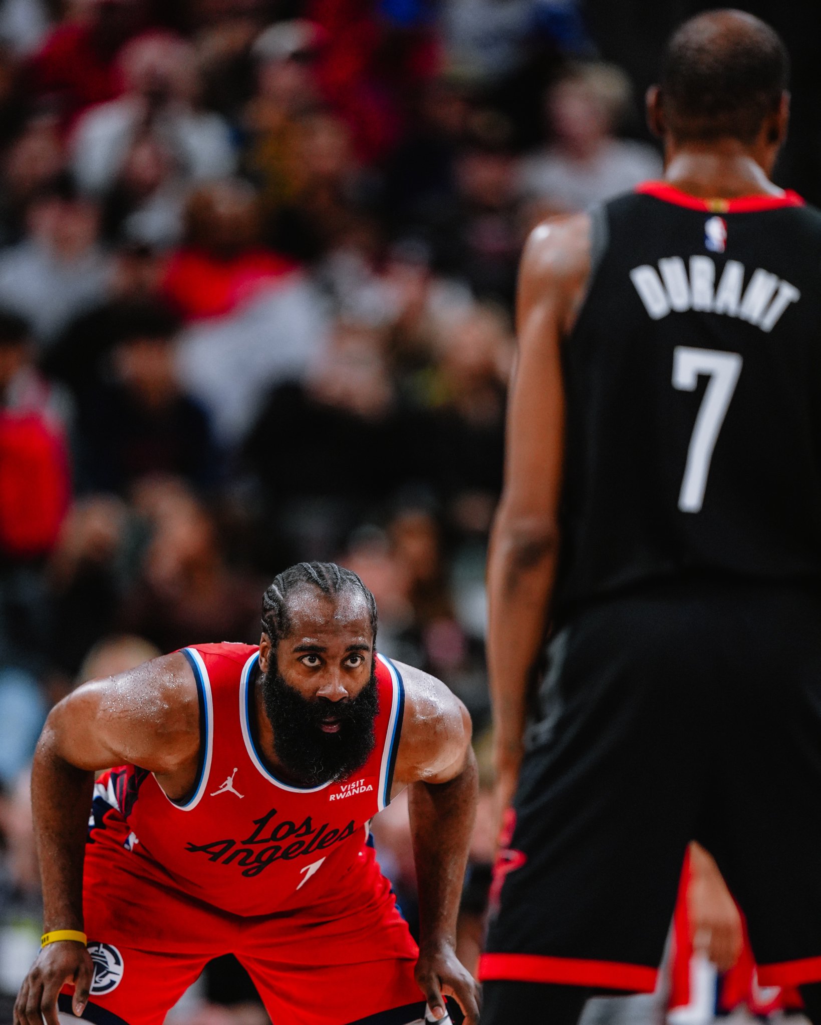 [流言板]專(zhuān)注的大胡子!快船官方分享今日哈登對(duì)位杜蘭特的賽場(chǎng)照