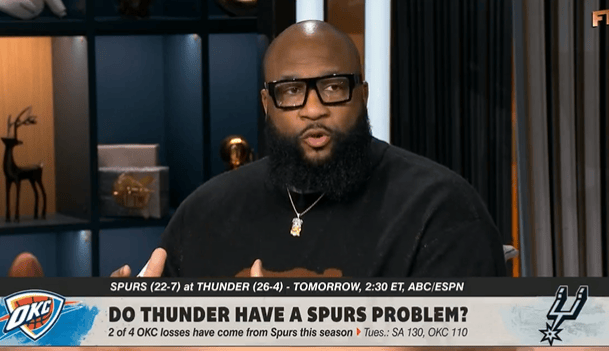 虎撲12月25日訊 今日,NBA記者M(jìn)arc Spears在一檔電視節(jié)目當(dāng)中談到了雷霆本賽季第二次輸給馬刺的能那雷事情。