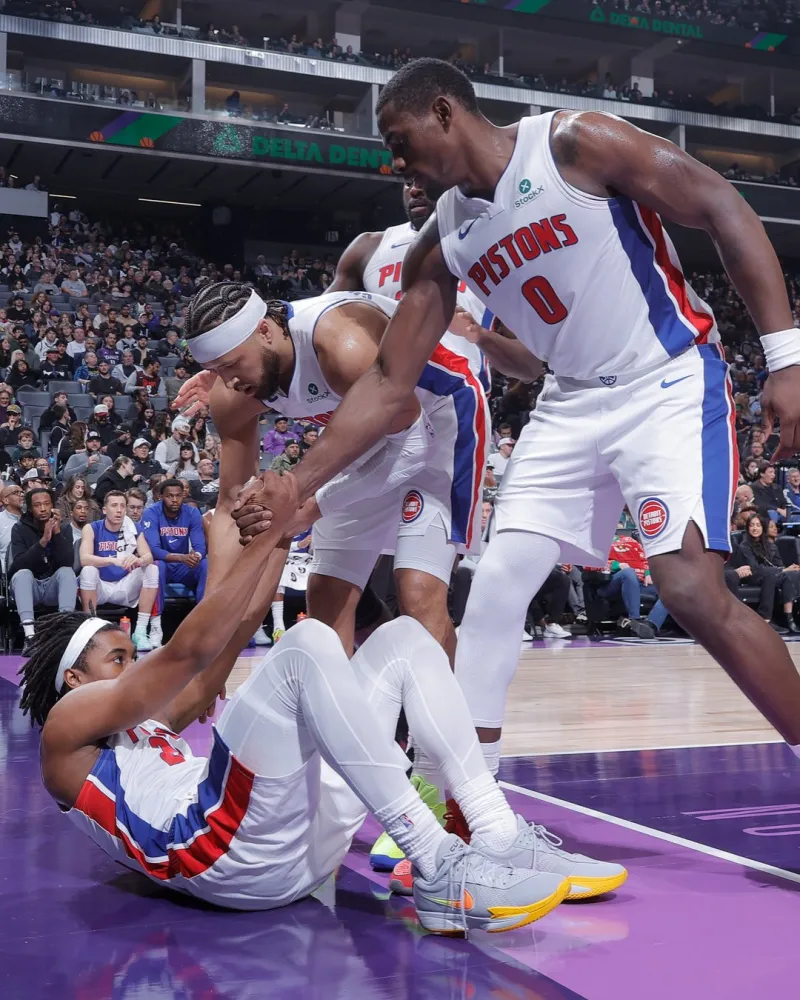 賽后,活塞活塞官方更新X,官方曬出一張活塞球員凱德-坎寧安和杰倫-杜倫攙扶隊友杰登-艾維的曬坎賽場照與球迷分享。