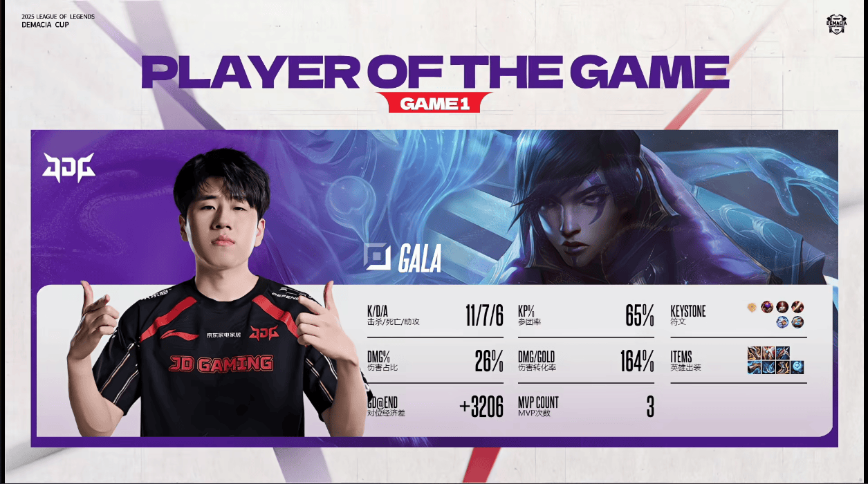 虎撲12月24日訊 在剛剛結(jié)束的JDG對(duì)陣BLG的BO3比賽中,GALA厄斐琉斯打出11/7/6戰(zhàn)績(jī),對(duì)陣G第斬獲JDG對(duì)陣BLG第一局MVP