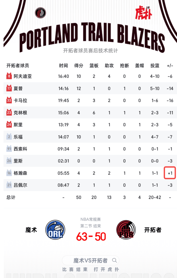 楊瀚森上半場正負值+1,是開拓者全隊唯一正負值為正球員,其余球員全為負值,夏普-14、卡馬拉-16、克林根-11。