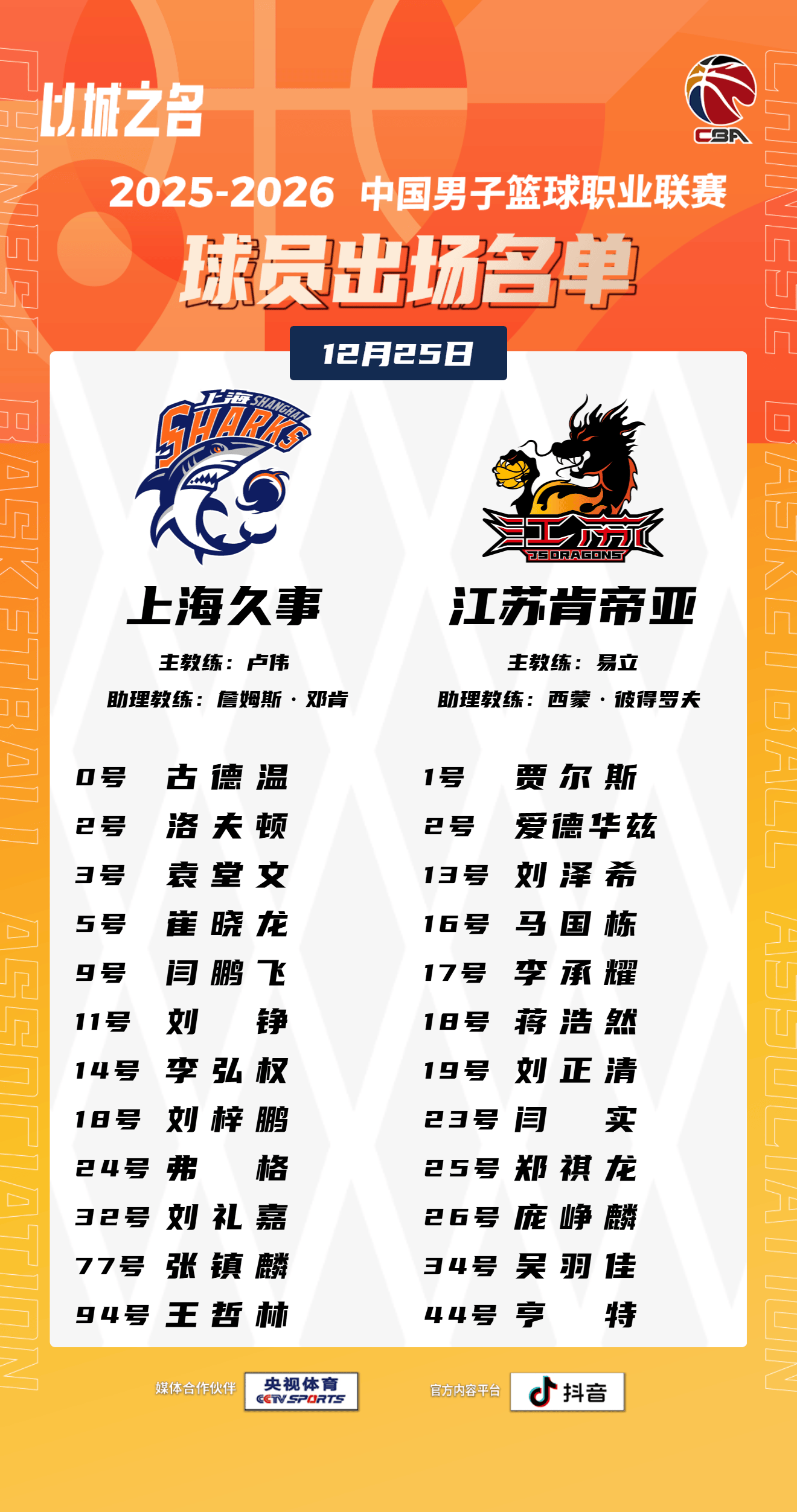 虎撲12月25日訊 今日CBA常規(guī)賽,上海對(duì)陣江蘇的名單大名單已經(jīng)出爐。