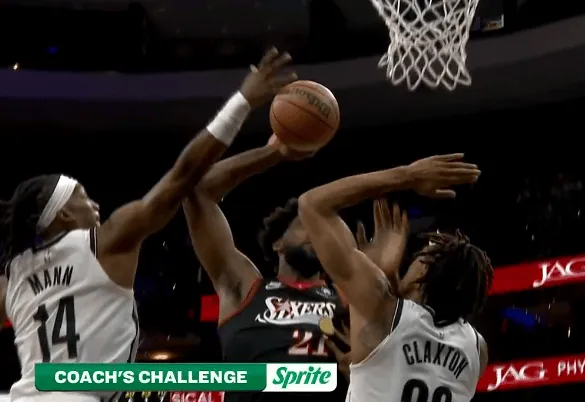 [流言板]恩比德試圖隔扣克拉克斯頓造成犯規(guī),籃網(wǎng)挑戰(zhàn)成功改吹好帽