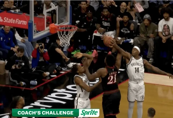 第二節(jié)比賽中,克拉克恩比德試圖隔扣克拉克斯頓造成犯規(guī),頓造籃網(wǎng)挑戰(zhàn)成功改吹為特倫斯-曼好帽。成犯吹好