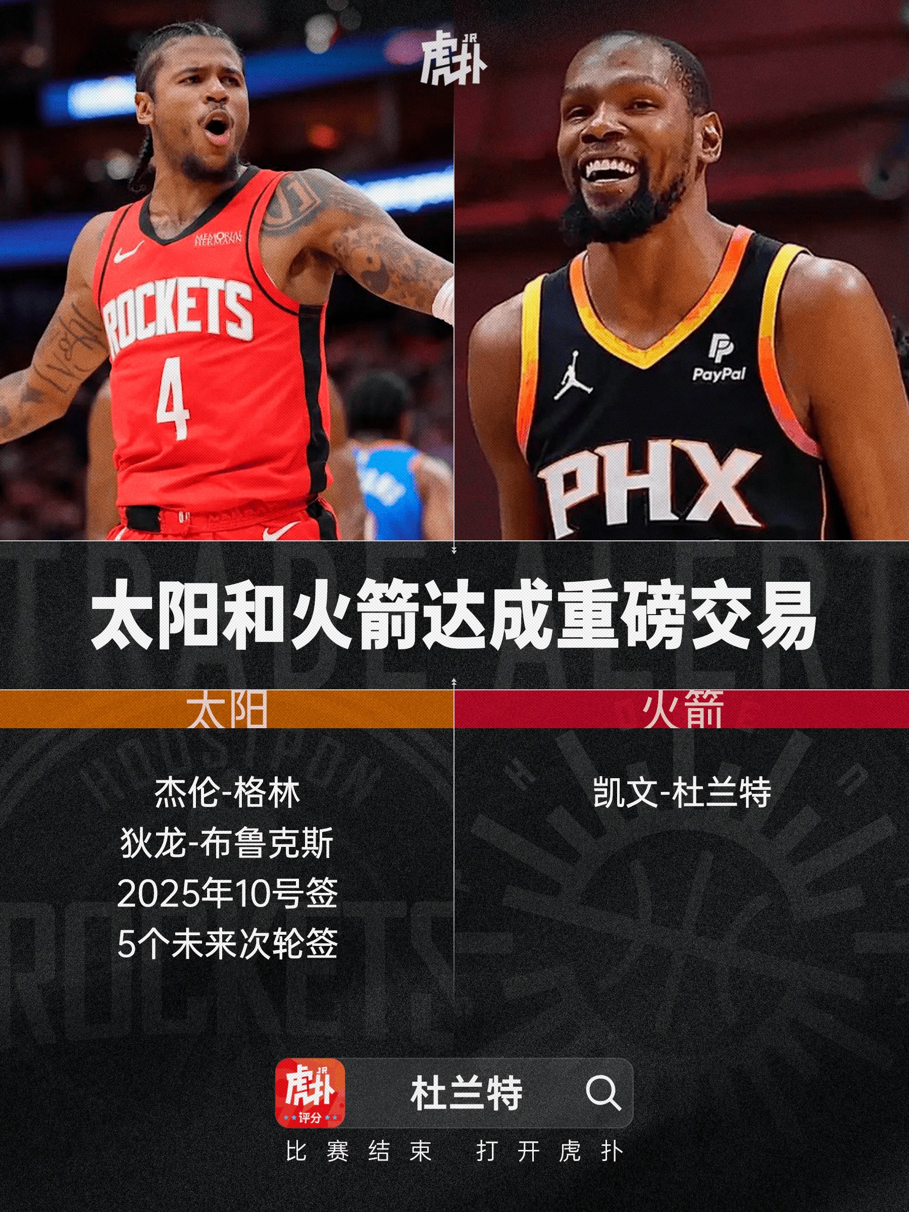 虎撲06月23日訊 太陽(yáng)和火箭就凱文-杜蘭特達(dá)成一筆震撼交易。