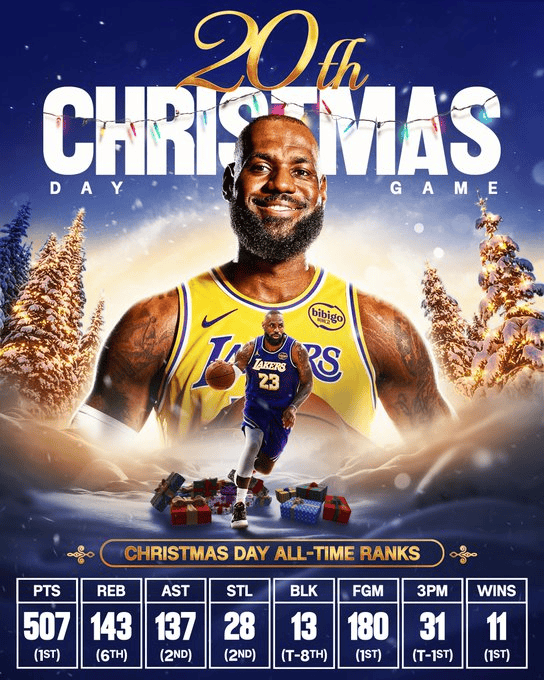 根據海報上的數據顯示,詹姆斯圣誕大戰(zhàn)總計得到507分,共取得11場勝利,均位列歷史第一!