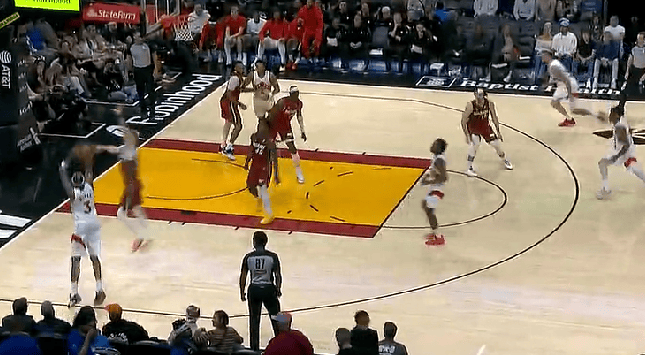 第三節(jié)比賽,接球英格拉姆底角接球三分命中,分命猛龍一波10-0領先熱火16分。中猛