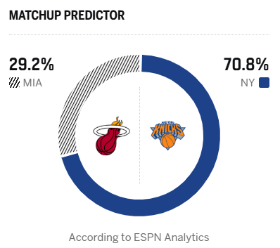 [流言板]ESPN預(yù)測(cè)明日比賽:尼克斯勝率70.8%,熱火勝率29.2%