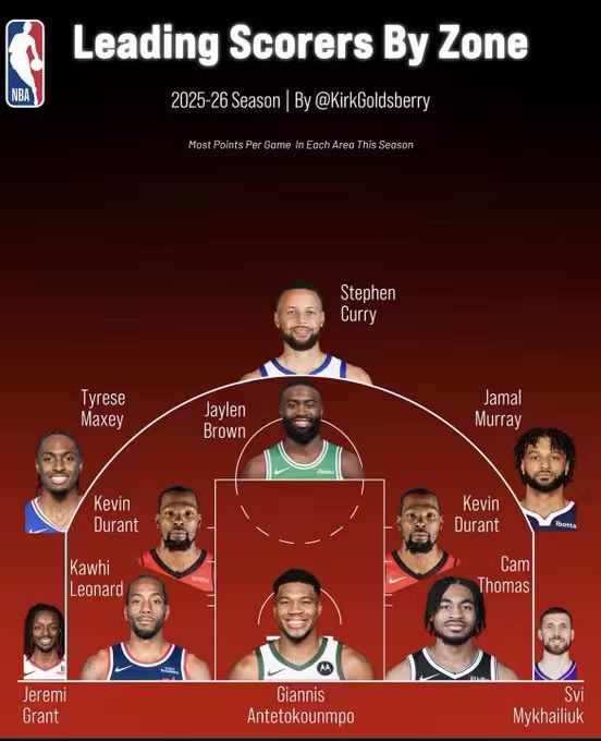 虎撲12月24日訊 NBA分析師Kirk Goldsberry近日發(fā)布了一張數(shù)據(jù)圖,內(nèi)容為本賽季至今,賽季各區(qū)域場均得分最高的各區(qū)高庫球員。