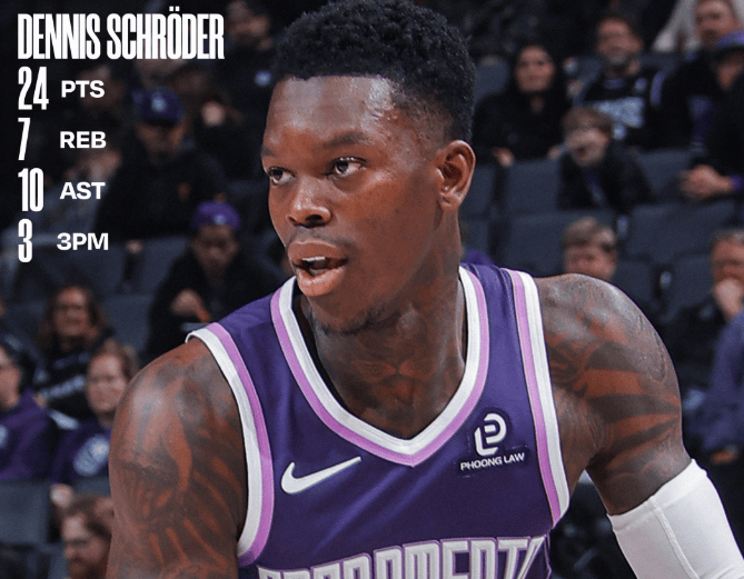 國王球員丹尼斯-施羅德全場出戰(zhàn)24分鐘,季首13投7中,三分8中3、罰球8中7得到24分7籃板10助攻。
