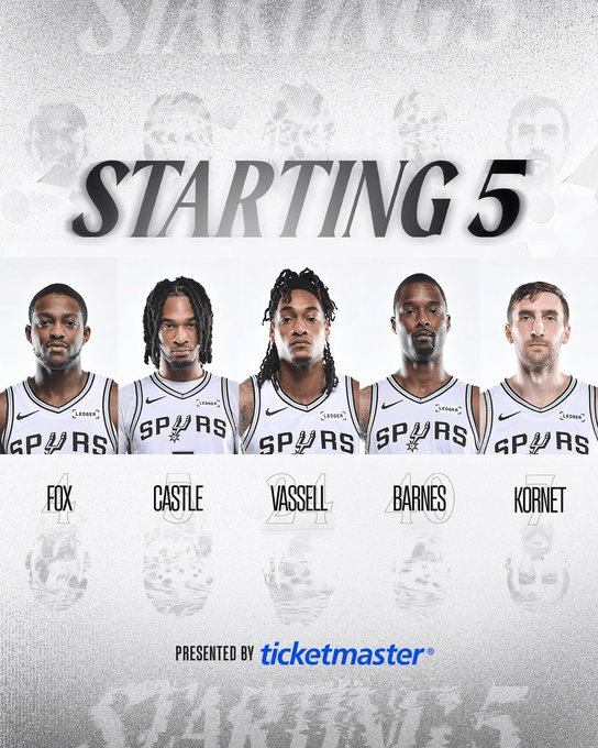 馬刺更新官方社媒,刺首公布了今日比賽的發(fā)福首發(fā)陣容。