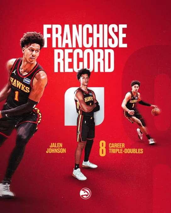 今日,流言倫老鷹官方更新動態(tài),板隊曬出一張海報慶祝杰倫-約翰遜當(dāng)選隊史三雙王: