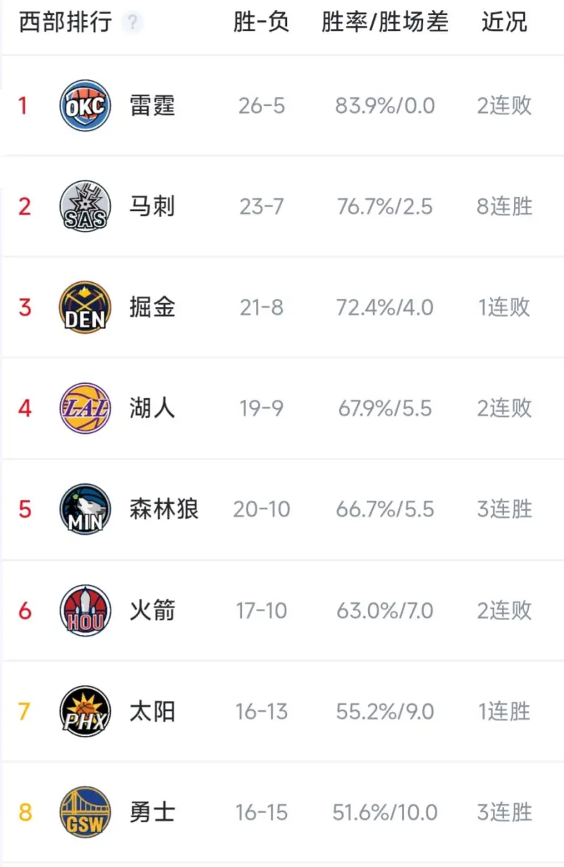 目前,板馬馬刺距離西部第一名的刺豪雷霆僅差2.5勝場。