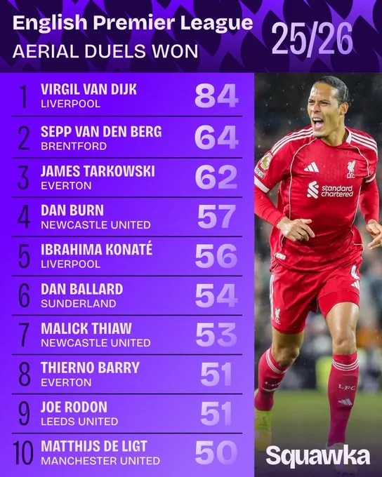 其中范戴克在本賽季英超中已經(jīng)完成137次解圍和84次空中對抗勝出,流言領跑兩項數(shù)據(jù)均排名聯(lián)賽第一。板范本季