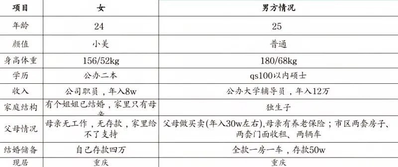 表弟和女朋友大學(xué)認(rèn)識(shí)的,到現(xiàn)在畢業(yè)談了四年了,最近準(zhǔn)備結(jié)婚,談了彩禮這部分,因?yàn)樗笥鸭也皇侵貞c本地的,所以表弟女朋友她媽說彩禮要十二萬,但是陪嫁只能陪幾床被子和家電。她媽還要留幾萬,說是要養(yǎng)老,但是我表弟說重慶這邊沒有這么高的彩禮,他們家接受不了。