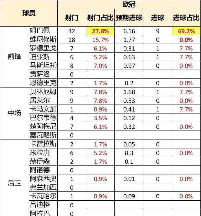 歐冠:姆巴佩射門次數(shù)占比27.8%,球數(shù)進(jìn)球數(shù)占比69.2%